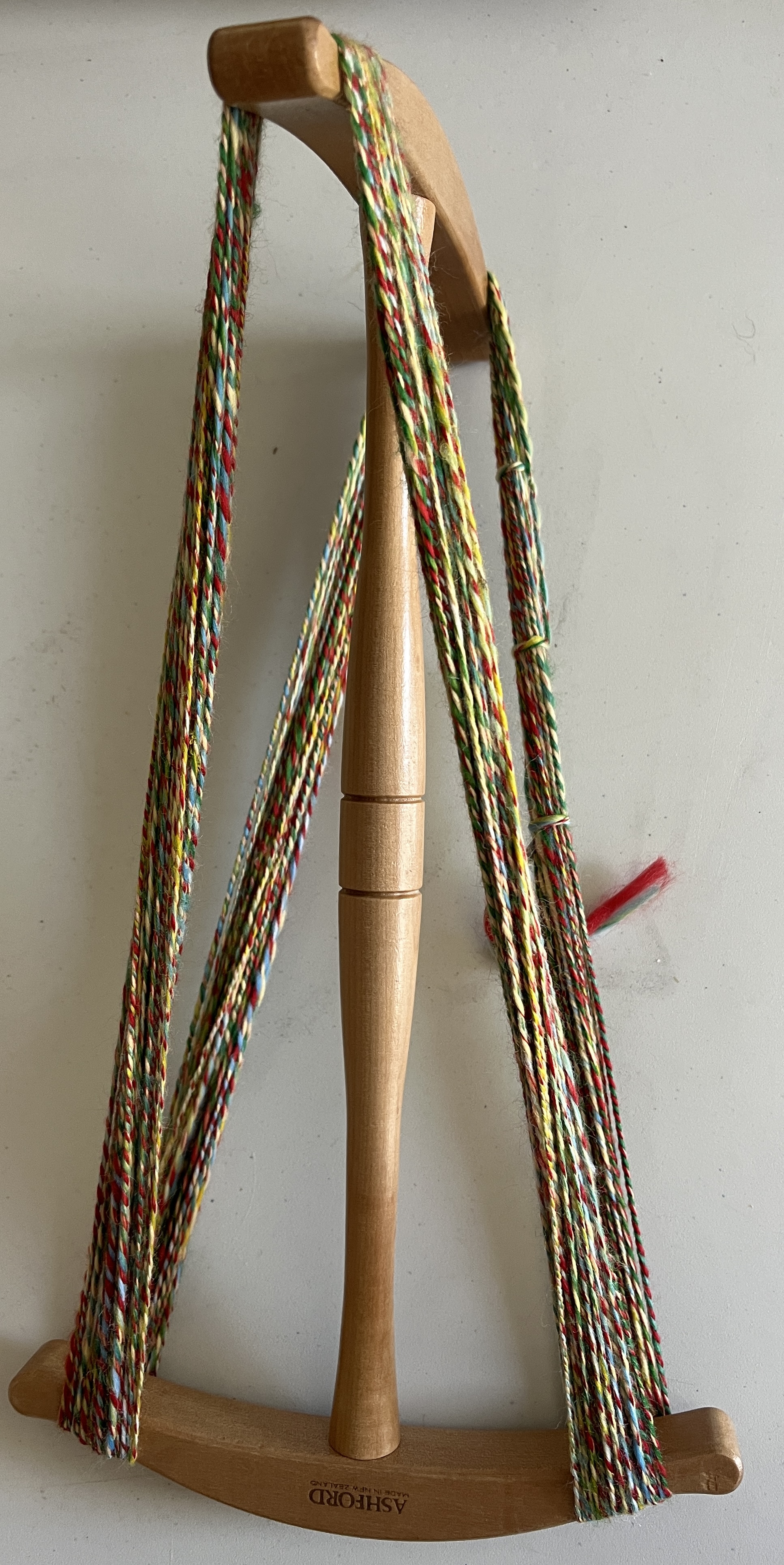 Since I spend a lot of my time making something or other that’s textile-related, today was no different. A couple of days ago, I dug out my Hackle (a rather dangerous-looking, spiky bit of equipment) to try processing some coloured, ‘Tops’ (prepared and dyed – in this case – sheep’s fleece). I wanted to try combining several colours but I haven’t used a Hackle for a very long time and the result wasn’t 100% successful but, I managed to spin the result. There were a couple of other colours left in the bag so I decided, rather randomly, to just spin them together and then ply it (twist it together) with the Hackled results. All that process completed, I now have a length of multicoloured yarn.